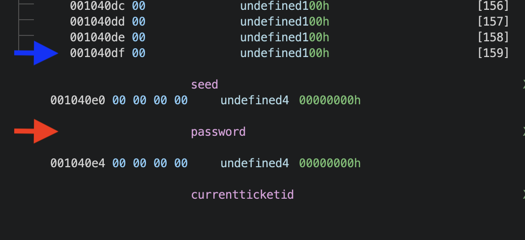 See above the global variable layout. The blue arrow is the end of the tickets array and the red arrow is the password value we can leak.
