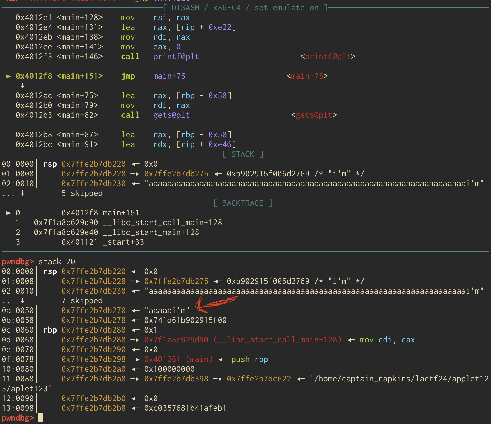 And just for fun (and because its always super cool) we can see our payload laid out on the stack within gdb before the main function cleans up the stack and returns.