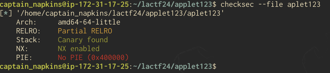 Lets take a look at what checksec has to say about our binary.
